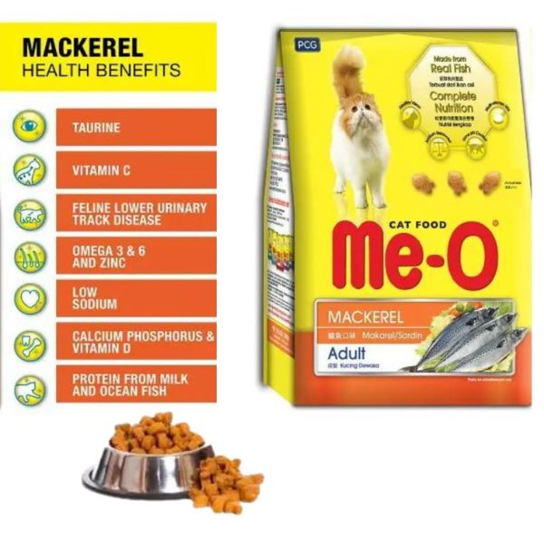 Me-O Mackerel Dry Cat Food is a premium dry food formulated to provide complete and balanced nutrition for adult cats. It features a delicious mackerel flavor that cats love. Packed with essential nutrients like taurine, vitamin C, calcium, phosphorus, and vitamin D, it supports your cat’s overall health, including strong eyesight, a robust immune system, and healthy teeth and bones. The low sodium content promotes heart and kidney health, while the omega-3 and omega-6 fatty acids enhance coat and skin conditions.