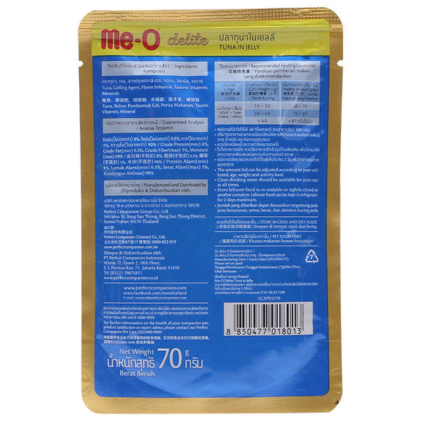 Me-O Pouch Delight Tuna in Jelly Wet Cat Food features real meat and real fish, delivering a variety of textures and flavors that cats adore. Give your cats a mouthwatering meal that they will savour from the first bite of Me-O wet food.