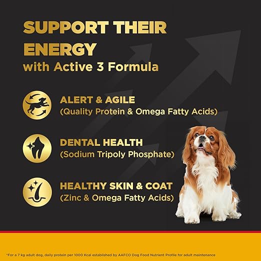 - ACTIVE 3 FORMULA: Proteins & omega fatty acids support alertness & agility. Sodium Tripolyphosphate (STTP) supports dental health. Zinc & omega fatty acids support healthy skin & coat.